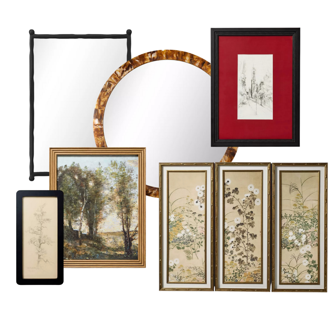 When picking mirrors or art look for unique mat colors or materials, and unique shaped or detailed frames.